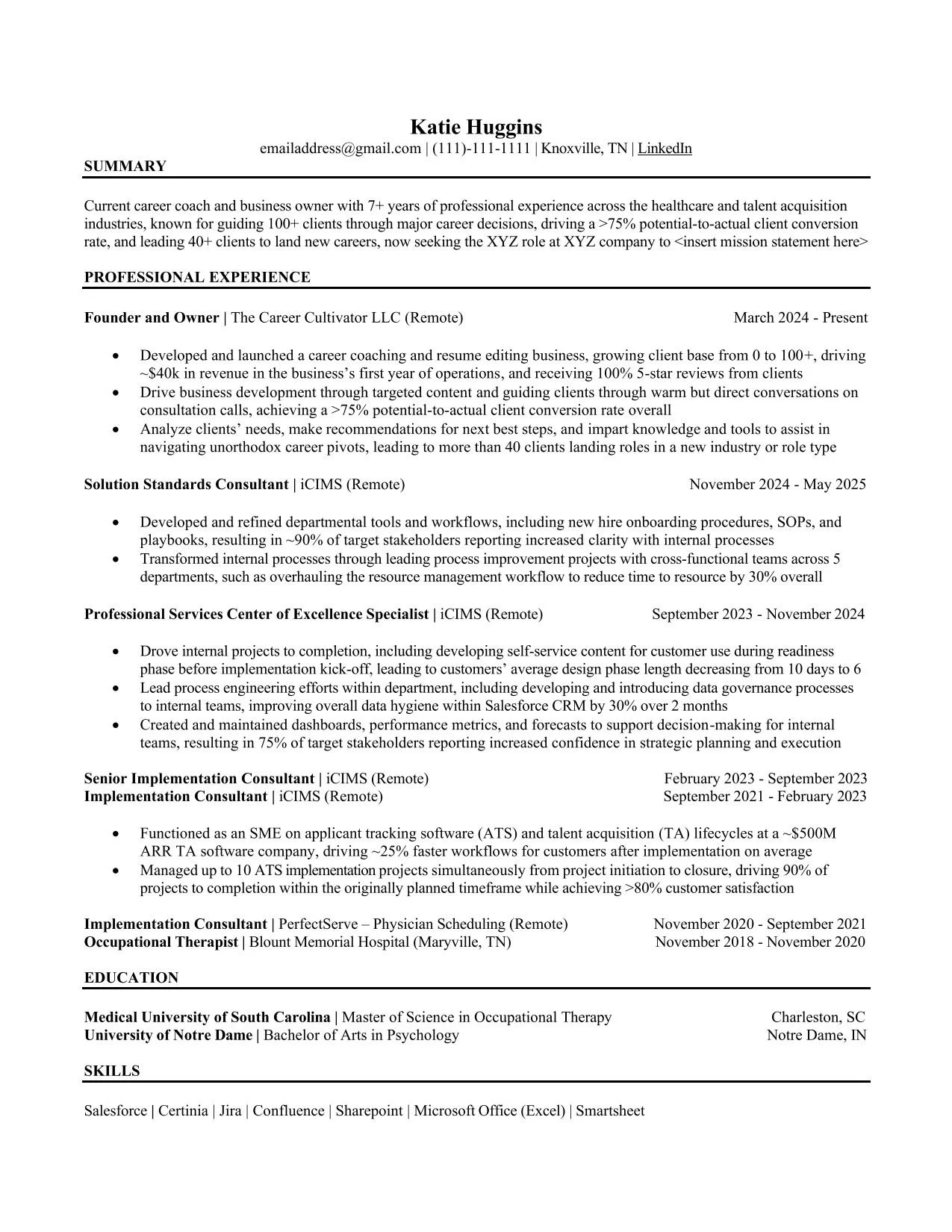My own personal resume as a real example, so you can see how to structure bullets, quantify results, and position your experience strategically